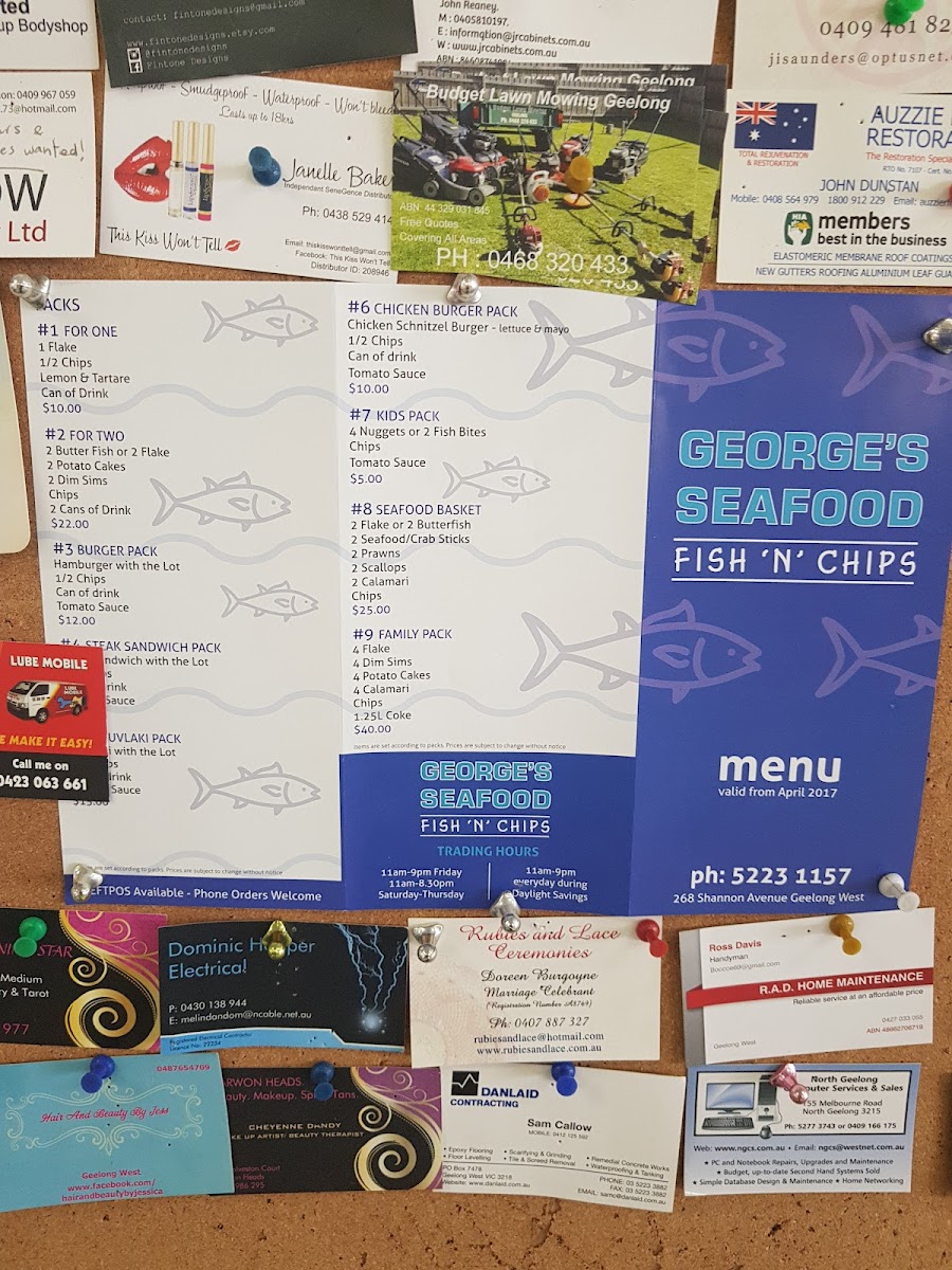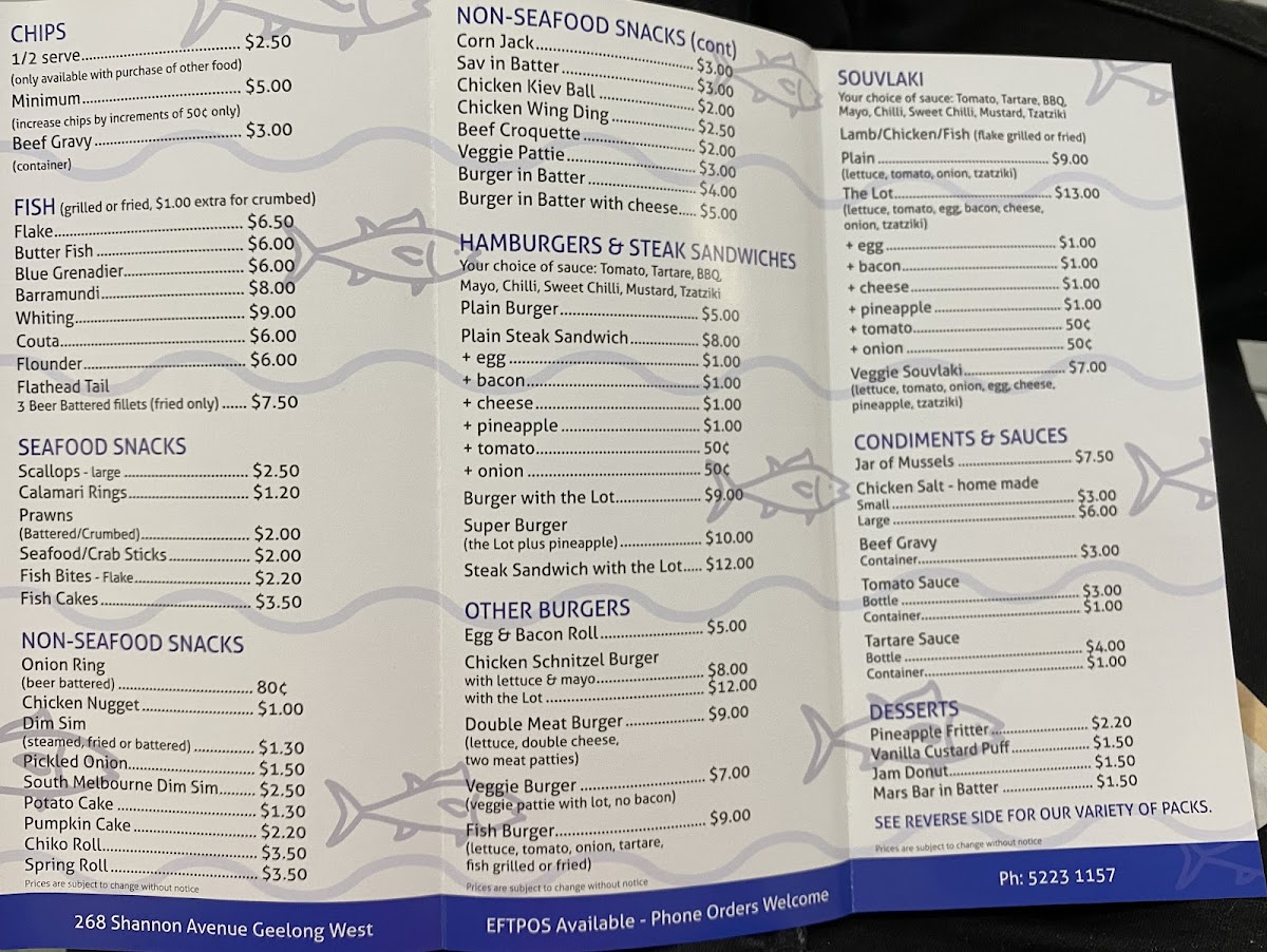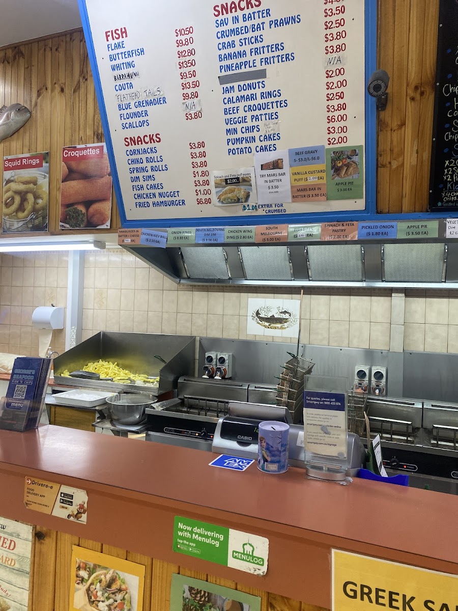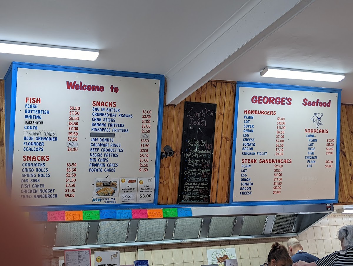 At George's Seafood, located at 268 Shannon Ave, Geelong West VIC 3218, the menu offers a delightful array of dishes that cater to various tastes, with options for seafood lovers, those seeking a hearty meal, and dessert enthusiasts.